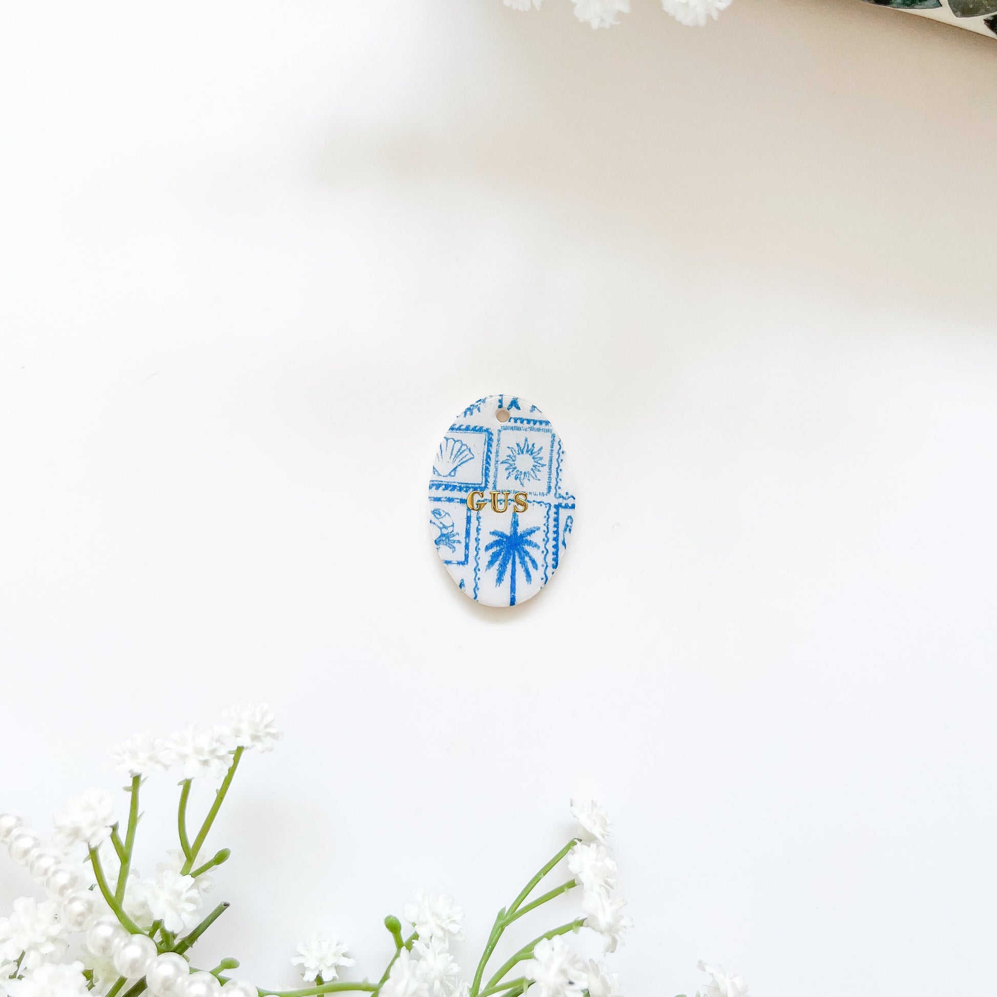 ✽ Safety & Care | Pet ID tags are choking hazards so please make sure you are monitoring your pet while they are wearing their ID tag. Keep your pet’s ID tags away from children and your pet when not being worn. UV resin is applied on top of the clay tag after baking (also known as glaze), resin may discolor over time but try to store tags out of direct sunlight.