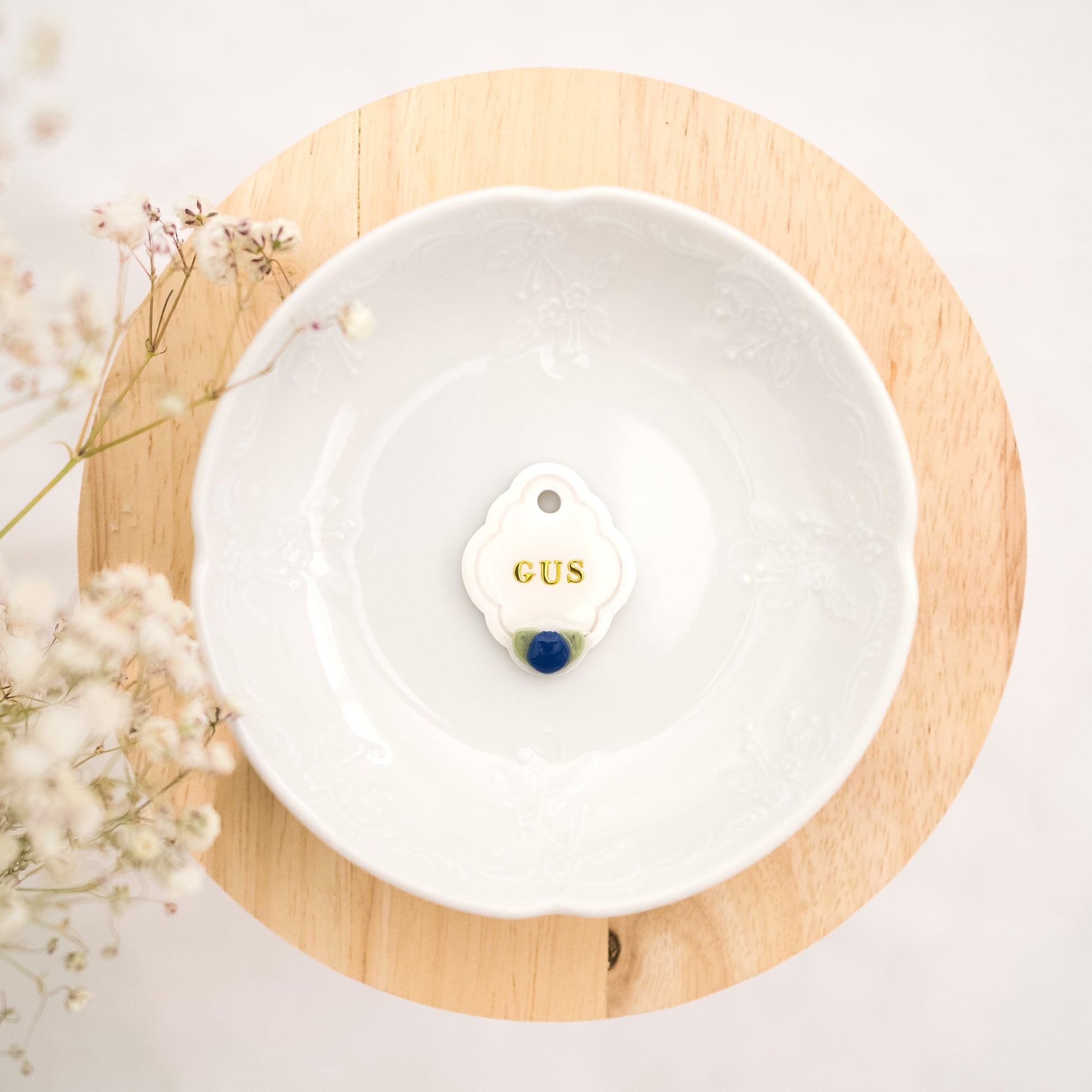 ✽ Safety & Care | Pet ID tags are choking hazards so please make sure you are monitoring your pet while they are wearing their ID tag. Keep your pet’s ID tags away from children and your pet when not being worn. UV resin is applied on top of the clay tag after baking (also known as glaze), resin may discolor over time but try to store tags out of direct sunlight.