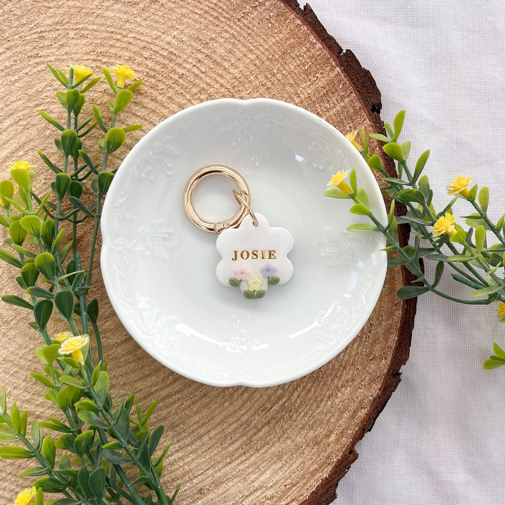 ✽ Safety & Care | Pet ID tags are choking hazards so please make sure you are monitoring your pet while they are wearing their ID tag. Keep your pet’s ID tags away from children and your pet when not being worn. UV resin is applied on top of the clay tag after baking (also known as glaze), resin may discolor over time but try to store tags out of direct sunlight.