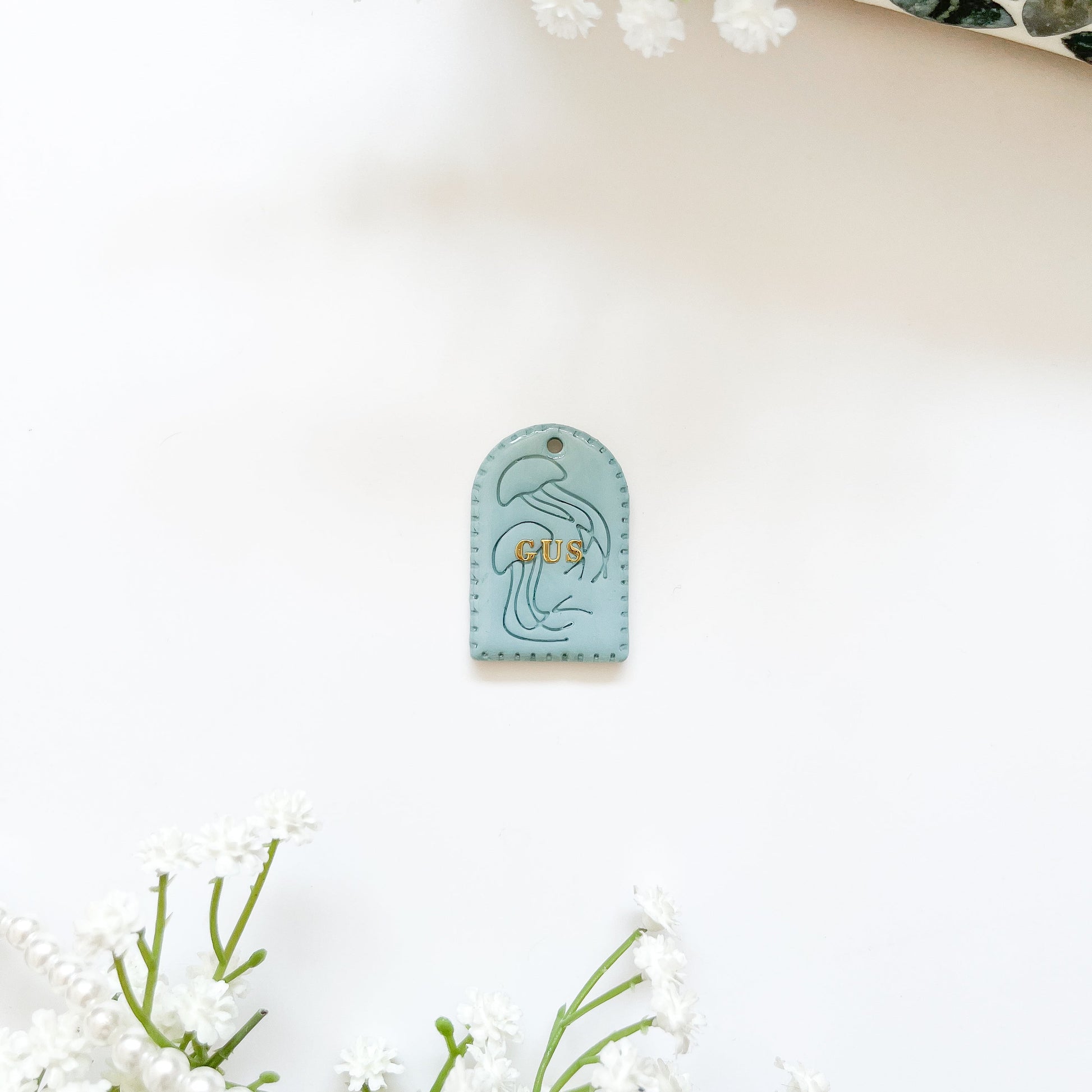 ✽ Safety & Care | Pet ID tags are choking hazards so please make sure you are monitoring your pet while they are wearing their ID tag. Keep your pet’s ID tags away from children and your pet when not being worn. UV resin is applied on top of the clay tag after baking (also known as glaze), resin may discolor over time but try to store tags out of direct sunlight.